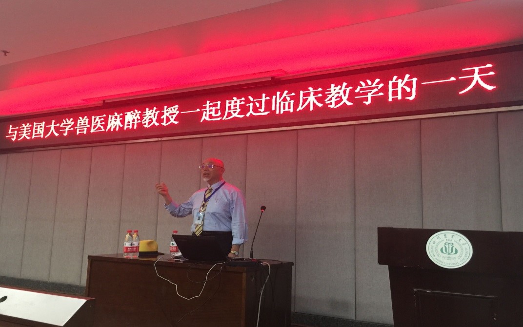 柯志恒教授以美国兽医招生选拔开头,为大家详细讲解了美国普渡大学DVM学生选择的标准。随后结合他本人在美国普渡大学兽医教学医院收集的大量临床病例图片以及视频,详细阐述了大动物(牛、马、羊驼、猪等)和小动物(犬、猫、兔等)以及部分野生动物(猫头鹰、鸟类等)在麻醉前动物以及人员的准备、麻醉药物的选择、麻醉深度控制以及术中镇痛药的选择等。