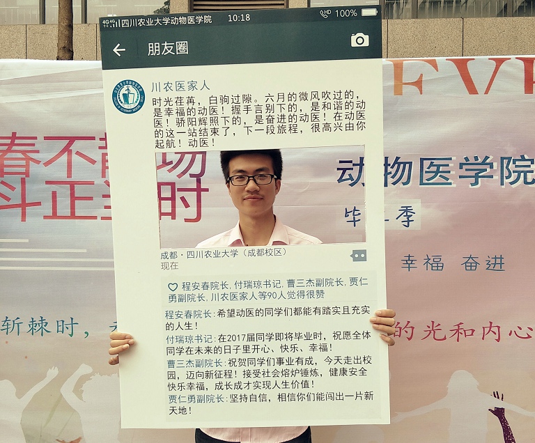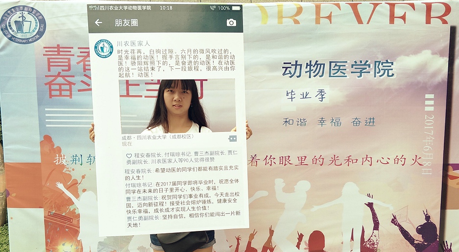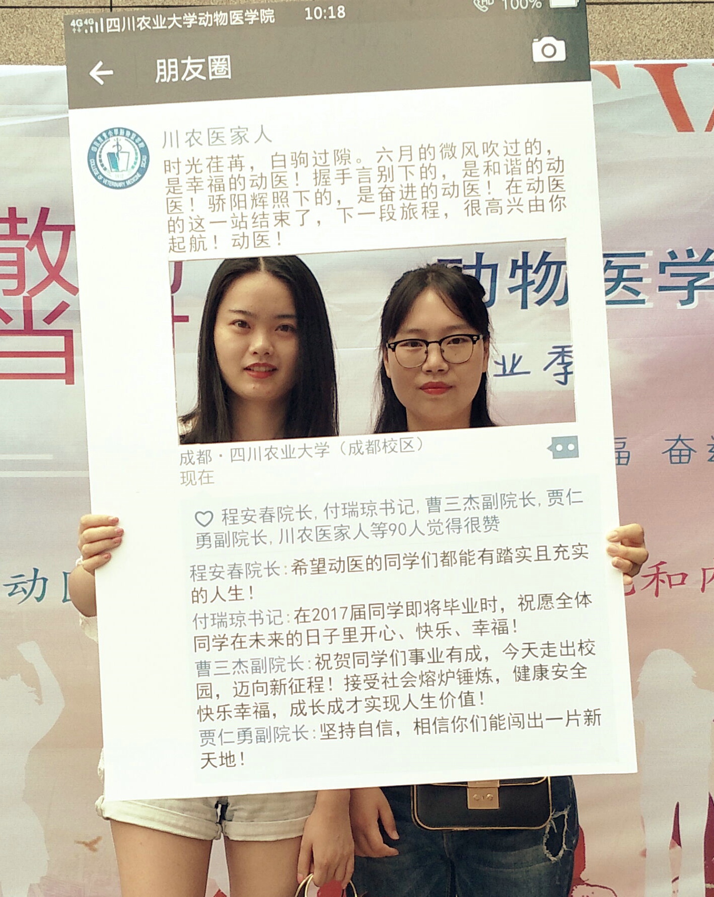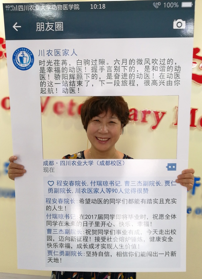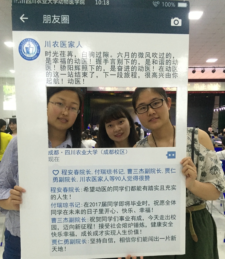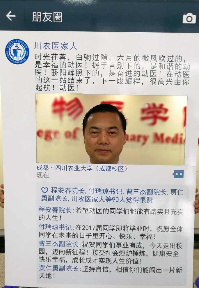 “朋友圈”有学院90位老师的“点赞”,和四位院领导的互动留言:程安春希望动医的同学们都能有踏实且充实的人生。付瑞琼祝愿同学们开心、快乐、幸福!曹三杰祝贺同学们迈向新征程。贾仁勇鼓励并相信学生定能闯出一片新天地!“朋友圈”一经推送,就引来动医毕业生纷纷留影,或单独留念,或多人同框,或创意组合,学院院长程安春、党委书记付瑞琼等也和毕业生们一起加入到留影的队伍中。