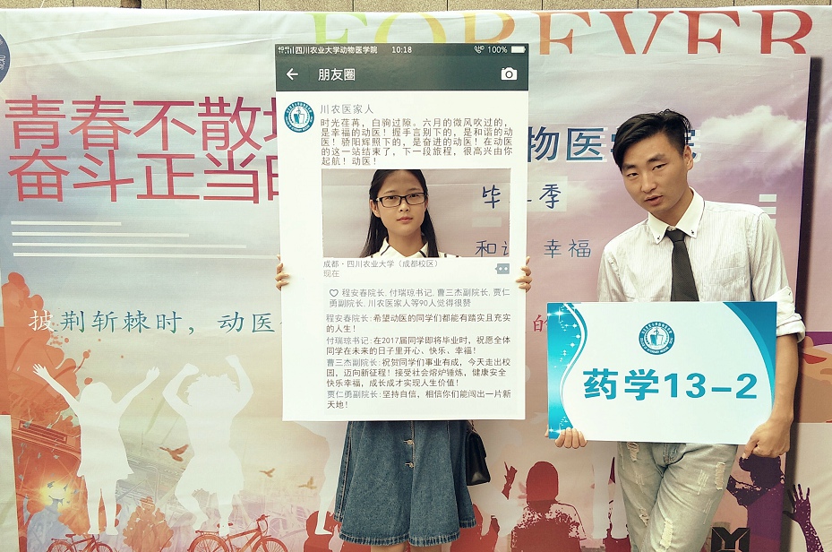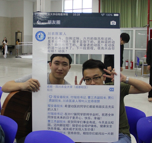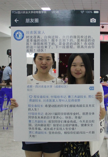 “时光荏苒,白驹过隙。六月微风吹过的,是幸福的动医!握手言别下的,是和谐的动医!骄阳辉照下的,是奋进的动医!……”近几日,动医2017届毕业生纷纷手举仿制的学院“医家人”微信朋友圈模板,留下特殊的毕业留影,并带着学院老师们的祝福,开启人生新旅程。