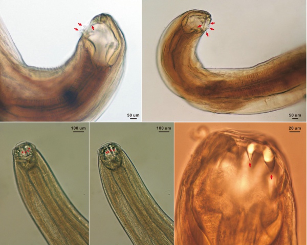 在显微镜下观察到的大熊猫钩口线虫及其口齿形态
