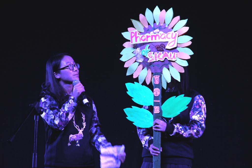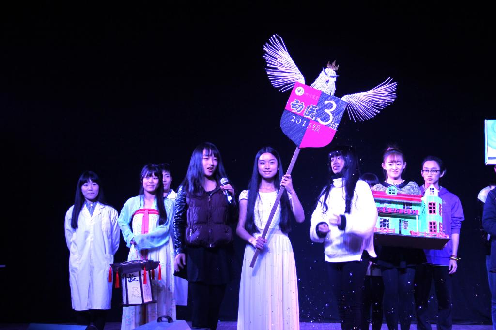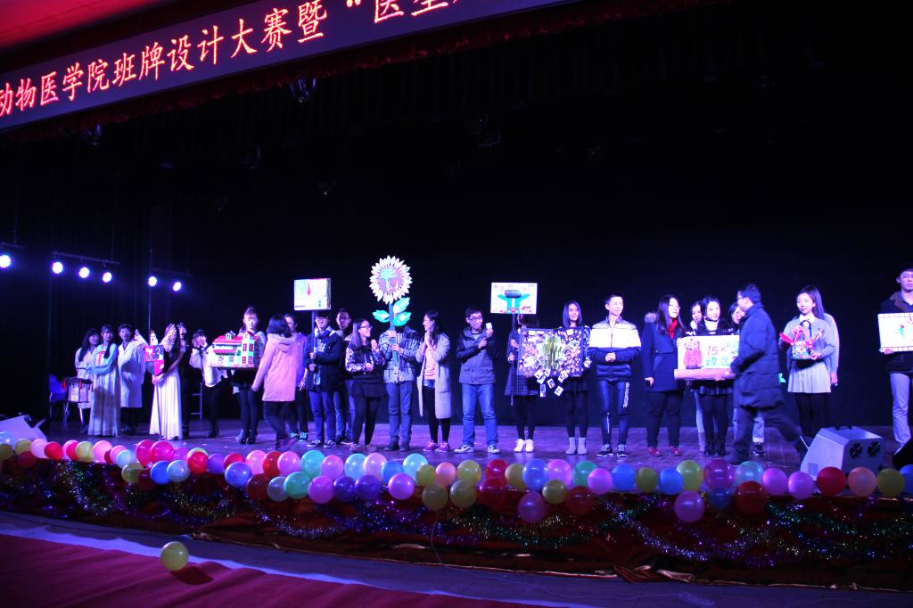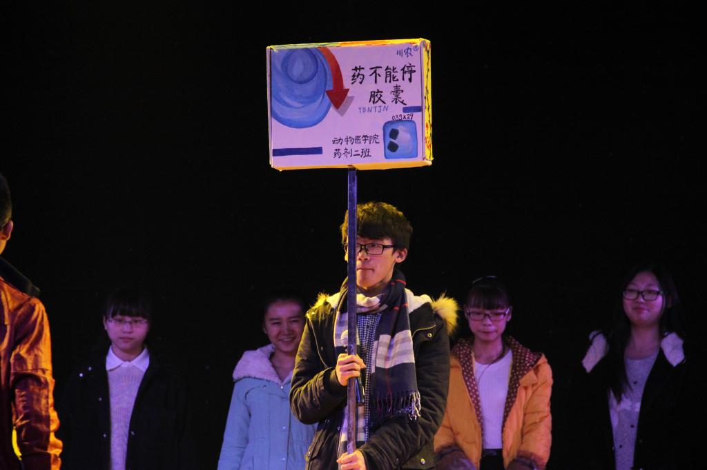各新生小班可谓是“八仙过海各显神通”,一个个独具匠心的班牌纷纷涌现而出,无论是令人赞不绝口的设计理念,还是精彩纷呈的班牌解说,都让得到场的嘉宾观众感觉眼前一亮,场下欢呼声、掌声不断重叠。只见动检二班携六角宫灯缓步行来,长明舞台,富韵古典,古色古香的创意风格吸引所有人的视线。“守护生命是我们的职责。”动医三班带来“沙漠之鹰”班牌,而动医一班则别具一格地讲了一段“不煽情的故事”。“十年后,听人说起那些关于川农的语言”,药物二班唱响一曲“那些追梦的日子”,“这里还有一个单词——forever!”药学一班的“向日葵”洋溢着他们青春的气息,药物一班用手语的《爱》捧起良心的好药。药学二班风格迥异,用两个老友的对话,巧妙地将己班的设计理念清晰而又无比震撼地暴露在观众的眼前,引来呼声一片!动医二班将猫头鹰立在树上:“在中国古代,猫头鹰被视为不祥之鸟,把它当作厄运和死亡的象征。但是我们在想,我们如果成为猫头鹰,就能够预知病情,将疾病根治!”他们还创新地设计了自己的班级logo,用蜗牛寓意“我牛”。动检二班制作了“放映机”班牌,深情款款的诗歌朗诵将大家带入春夏秋冬四季轮回的美好回忆当中,动医本硕的合唱亦是使晚会增色不少。