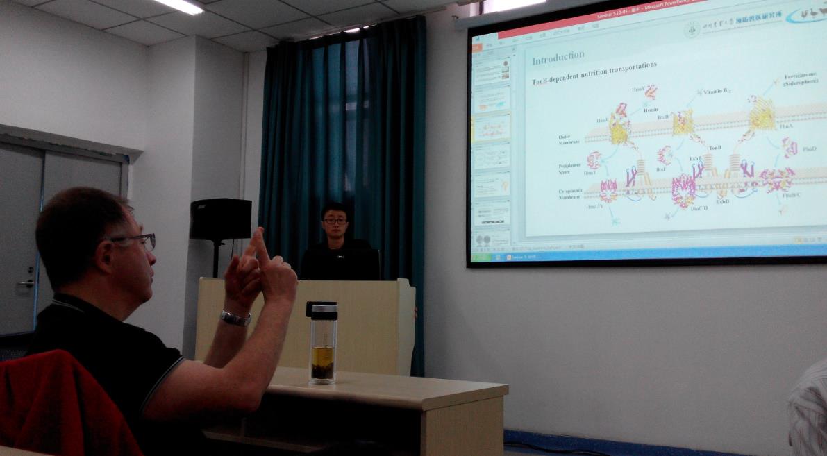 10月9日,Francis研究员参与了预防兽医研究所研究生每周例行的读书报告会(seminar)。会上,两名研究生均用英语进行了阐述,其中14级博士研究生韩月的英文水平及表达能力给Francis研究员留下了深刻的印象;13级硕士廖何斌分享了自己硕士期间的研究内容,Francis研究员对进一步研究内容给予了建议和指导。