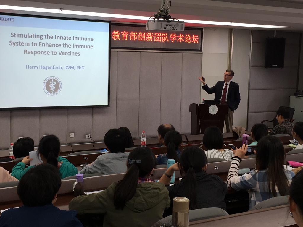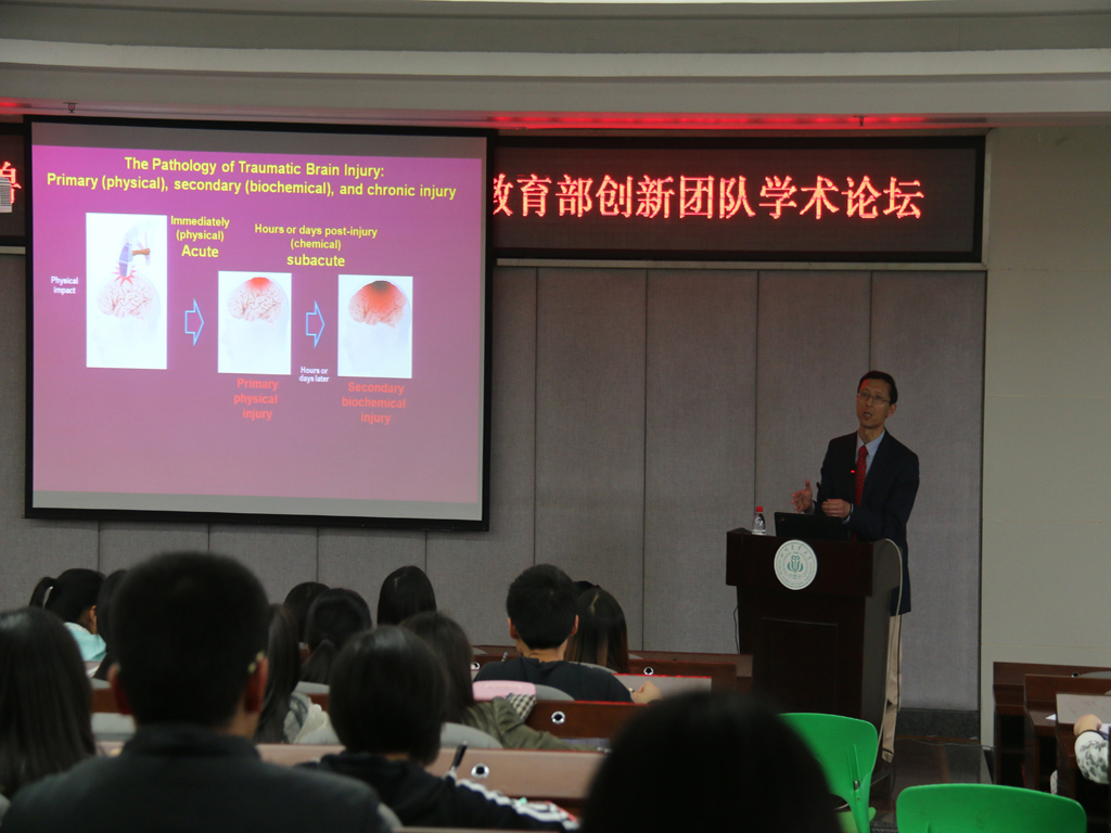 下午,Harm HogenEsch副院长和史日异教授分别作了题为“Stimulating the innate immune system to enhance the immune response to vaccines(调节天然免疫系统,增强疫苗免疫反应)”和“Chemical injury mechanisms in CNS trauma and diseases role of oxidative stress and acrolein(氧化应激和丙烯醛在中枢神经系统损伤和疾病中的化学伤害机制)”的专题学术报告,近200名研究生和本科生参加。