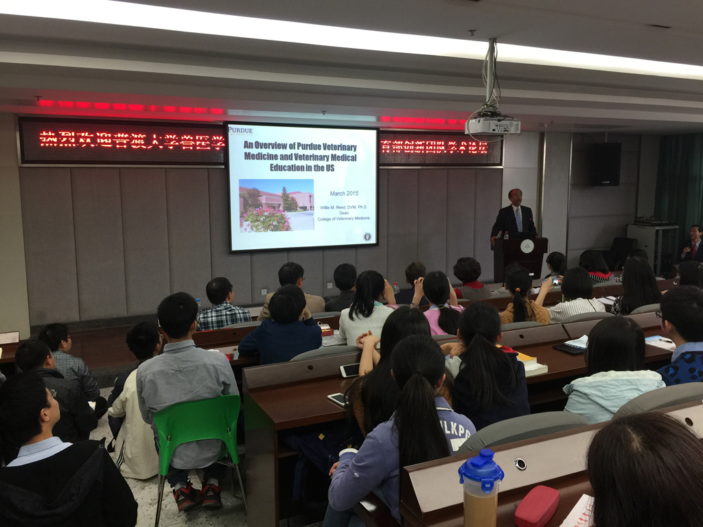 随后,Willie M. Reed院长在1教309报告厅作了题为“An overview of Purdue Veterinary Medicine and Veterinary Medical Education in the US(美国和普渡大学的兽医教育)”的主题报告,200多名学生聆听报告,现场气氛热烈。Reed院长图文并茂介绍了普渡大学的历史、规模、校区布局、学院设置,美国的兽医本科生学习年限、规模、兽医学院分布,以及普渡大学兽医学院的历史、学生就业、师资力量、实习基地、国际合作、录取标准、本科教学方法、内容和目标等内容。学生们就兽医毕业生的就业机会、收入水平、教学方式、博士培养年限、中兽医在美国的发展等问题与Reed院长进行了热烈的讨论。