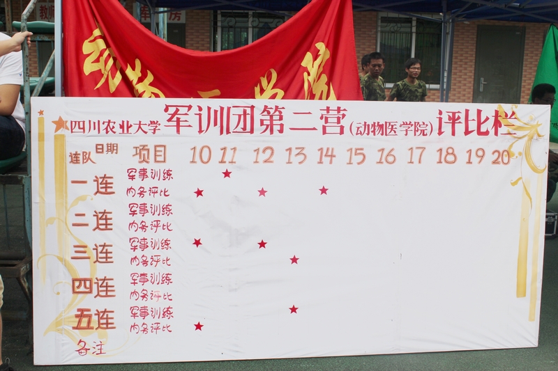 评比展板展示于军训场地中bat365官方网站的休息区旁,内容包括二营中男女训练连总共五个连队的军事训练、内务评比两个项目,评比日期从9月10日持续到9月20日,每日根据各连队的队列训练情况与内务整理情况进行打分,再经过综合衡量,将优秀连队在展板上标注展出。