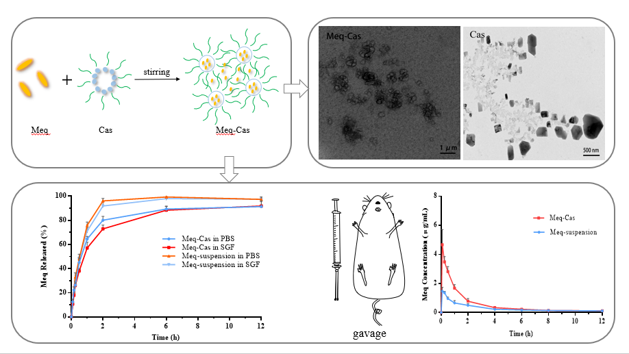 乙酰甲喹是一种优良的广谱抗菌药,主要应用于密螺旋体所致的畜禽肠道感染,为降低养殖成本、减轻动物应激反应,生产上主要通过水饮或拌饲的方式给药。目前水溶性差、口服生物利用度低是限制乙酰甲喹疗效和临床应用的关键因素。酪蛋白作为一种天然来源的蛋白质,因其具备特殊的两亲嵌段结构,能够和水溶性差的药物通过胶束增溶机理自组装形成纳米级别的核壳结构复合物,进而改善药物的水溶性,促进药物吸收和传递。该研究制备了酪蛋白包载乙酰甲喹的纳米复合物,并对其处方工艺进行优化,通过体外释药和药动学研究评价复合物对乙酰甲喹口服吸收和生物利用度的改善程度,为提高乙酰甲喹口服生物利用度、扩大酪蛋白为基础的药物传递系统研究提供理论基础。