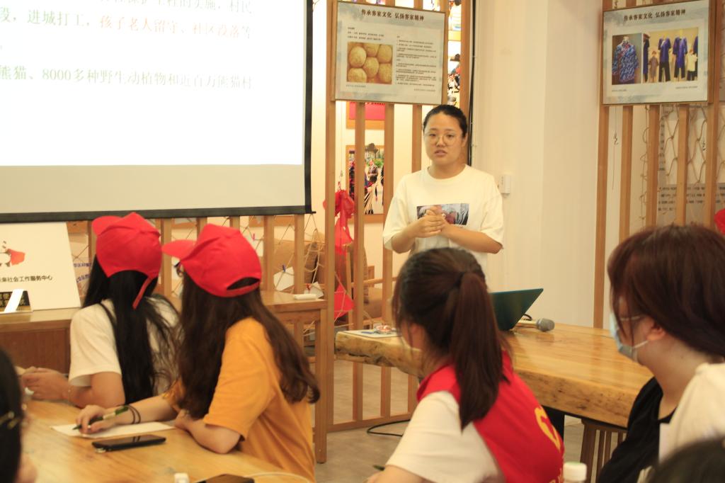 在熊猫家体验空间,守护熊猫村发起人、“约未来社会工作服务中心”理事长赵松生老师简要介绍了守护熊猫村和零星熊猫项目背景及主要行动。全国高校大熊猫保护与发展联盟创始人张港旋与守护使们分享了自己在学生时代与守护熊猫村项目结缘、亲身走进熊猫村开展调研的经历以及全国高校大熊猫保护与发展联盟概况,她与守护熊猫村项目见证了彼此的成长。大学在校园举办大熊猫主题活动大获成功的经历也促使她下定决心,在毕业后成为一名社工专心投入到这项事业中,“守护熊猫村改变了我的人生轨迹,让我成就更好的自己”她感慨道。