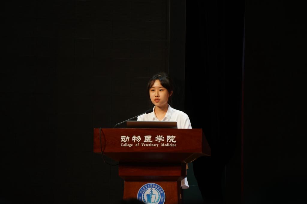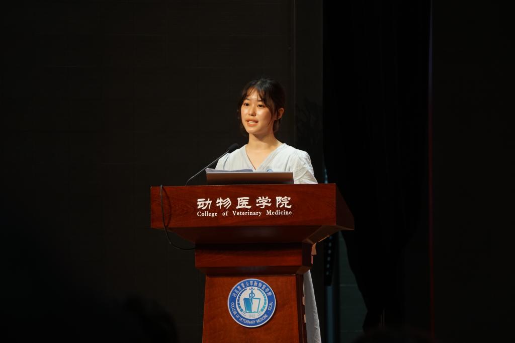 新生代表裴思雨代表全体新生感谢迎新期间学校、学院、老师和学长们的热情照顾和周到服务与指导,她和所有新同学们也感受到了学校学院浓郁的文化底蕴,雄厚的师资力量,幸福快乐的生活氛围,也立志向优秀前辈看齐,学有所成,做好“川农大精神”的动医传承人。