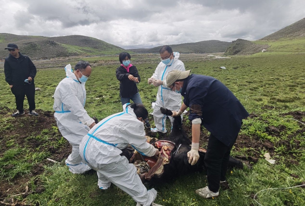18日上午,在新龙县农牧农村科技局人员的陪同下,bat365官方网站四位专家又一次前往新龙县友谊乡,对牧户中的一头牦牛突然死亡进行现场病例解剖与疾病诊断。专家团队冒着高反的不适,在牧场下风口进行了为期一个半小时的病死牛只病例解剖。通过解剖发现,该牛只死于肺炎,气管中充满白色泡沫样痰,牛只运动导致急性呼吸衰竭而死亡,专家团队还对发病组织取样带回单位实验室进行病理学分析。随后,针对牧户反馈牦牛群中有部分牛只也出现相同病症,专家团队开具了处方单,并向牧户一一介绍了各药品的使用方法和剂量。