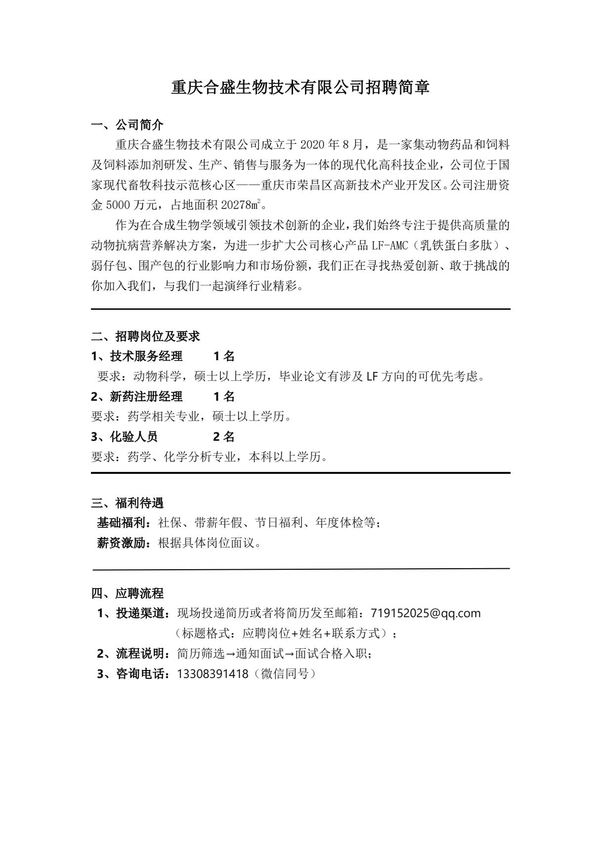 【3月27日专场双选会】重庆合盛生物技术有限公司招聘简章