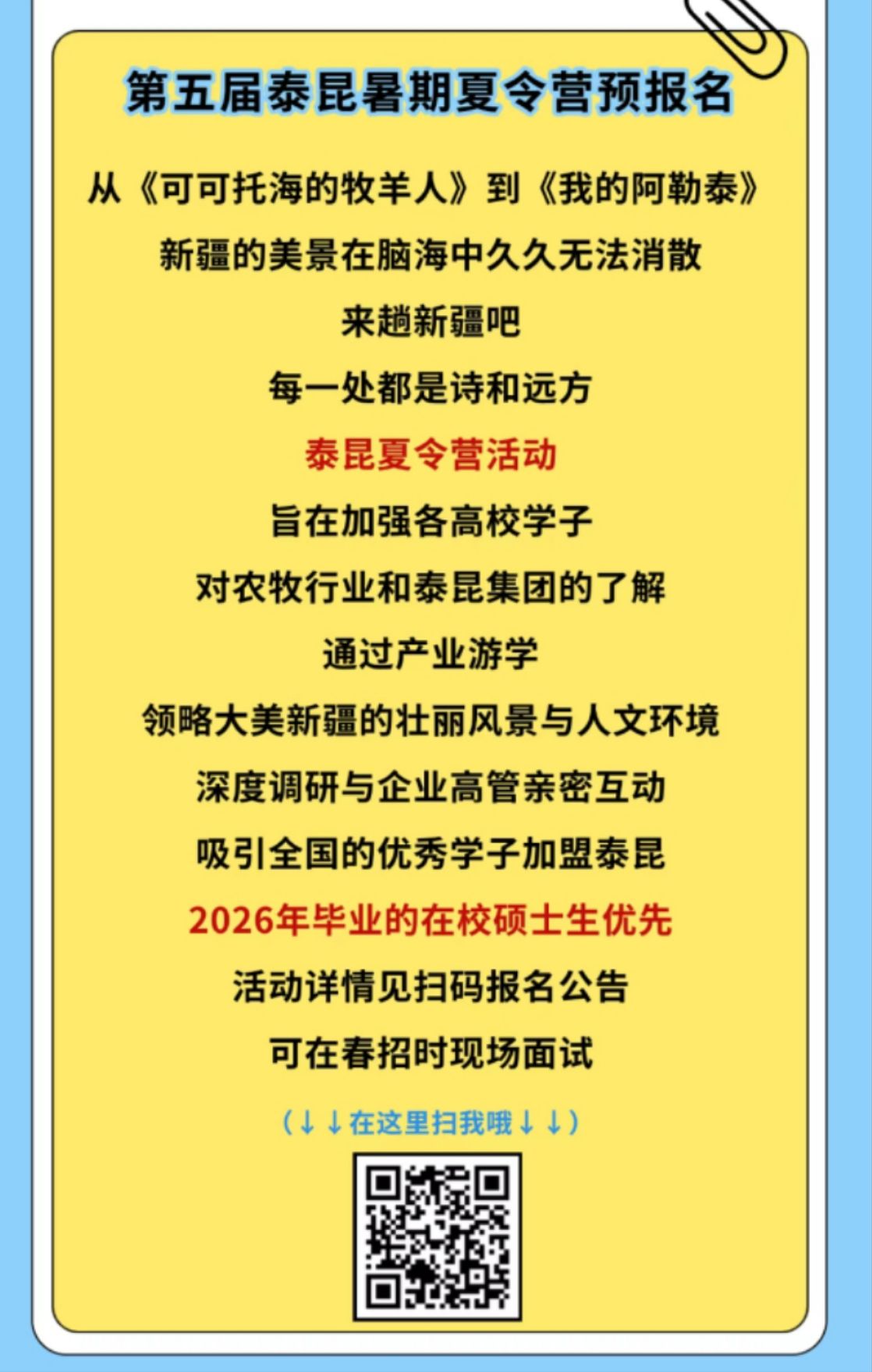 泰昆集团计划7月底8月初开展为期5天的第五届夏令营活动,相信你们周围的学长学姐已经参加或报名过。去一趟新疆吧,往返机票、全程食宿泰昆全都承担,参加宣讲了解详情,扫描二维码填写资料,宣讲现场互动交流,争取参营名额,可以延续安排实习,你还在等什么?