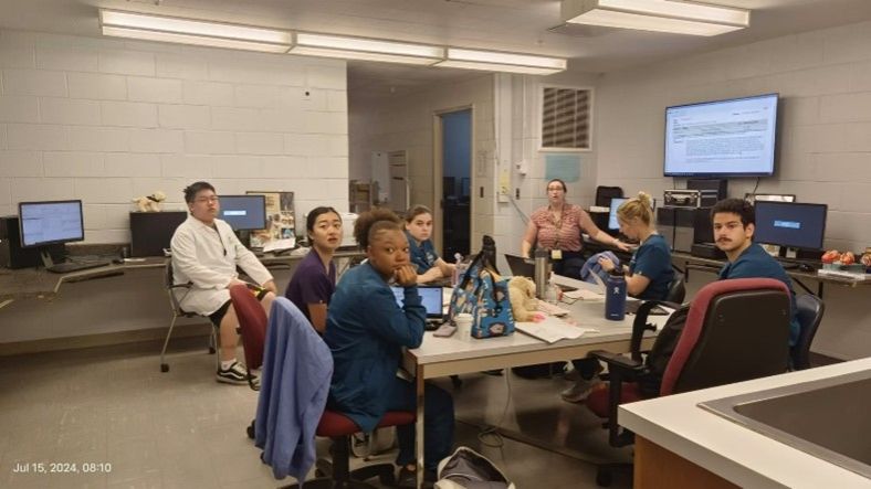 在第一周的临床实习轮转中,两名同学按照先前拟定的实习项目,被分配到不同科室进行实习轮转,包括小动物医学、内科、小动物矫形外科、骨科、ICU/ER、心脏科、肿瘤科、麻醉科和社区宠物兽医。轮转过程中,两名同学不仅要参加不同科室每日的圆桌会议、病例分析,而且要作为普渡大学兽医院4年级DVM学生的助手参与医院各种日常诊疗与手术。面对全英文交流环境以及众多陌生的临床医学专用术语和无预习无演练的实操,两名同学在普渡大学实习指导老师和医院医师的耐心讲解下,慢慢适应了实习氛围,逐渐跟上了所在轮转科室的紧凑节奏。