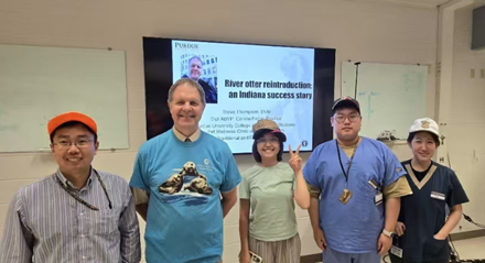 谢跃教授与普渡大学兽医院院长Dr.Salisbury、全球参与办公室主任Sheldon、瘫痪研究中心主任Riyi Shi教授以及明年普渡大学带队教师——麻醉科主任医师Dr. Jeff Ko就2025年bat365官方网站-普渡大学国际兽医交流生部份具体事宜进行了商议。