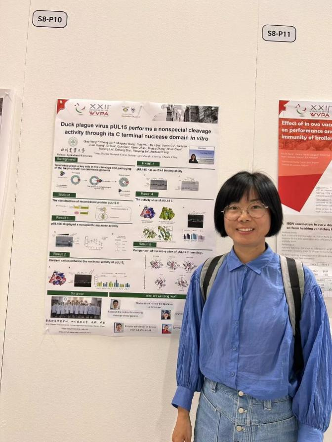 9月4日至8日,2023年世界兽医家禽大会(WVPA)在意大利维罗纳成功举办。来自全球各地的1700余名专家学者齐聚一堂,共同交流和分享家禽养殖方面的研究成果。bat365官方网站禽病防治研究中心青年教师杨乔博士受邀参会,并展示了名为“Duck plague virus pUL15 performs a nonspecial cleavage activity through its C terminal nuclease domain in vitro”(相关内容已发表在Veterinary Microbiology)的学术海报。