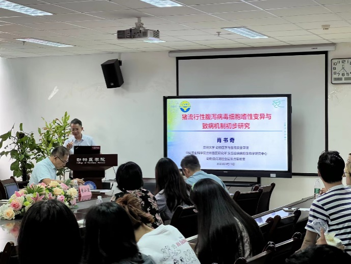 郭慧琛和肖书奇分别为大家带来题为“病毒样颗粒优化及应用策略”和“猪流行性腹泻病毒细胞嗜性变异与致病机制初步研究”的精彩学术报告。郭慧琛从病毒样颗粒的产生、优化及应用方面详细介绍了团队近年来的科研成果。肖书奇则为大家分享了猪流行性腹泻病毒PEDVS基因和E基因在细胞嗜性和致病机制中的作用和机制。教授们的讲座深入浅出、通俗易懂,给学院师生带来了一场学术大餐。