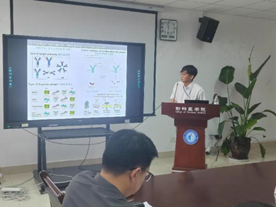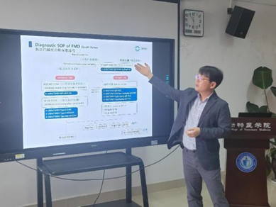 会议首先由文翼平副教授对猪病研究中心研究进展进行了简短介绍。随后,韩国MEDIAN商务部和市场部总监BOKYU KANG对MEDIAN公司的发展历程和全球合作做了介绍,并开展了“Current situation of PRRS in pig farms based on diagnostic test and how to control it”(猪场蓝耳病检测与防控)、“Classical swine fever in Japan and Korea, Quarantine and Vaccines”(日韩猪瘟免疫与检测) “Diagnostic principle of FMD and introduction of MDx’s FMD POCT kit”(口蹄疫诊断原则及MEDIAN口蹄疫快检方法)3个学术报告; 韩国MEDIAN研发中心产品开发部副主任Sang Ho Jang做了“Development Technology for Immunodiagnostic Products”(MEDIAN免疫诊断制品技术开发)和“Introducing Median Diagnostics ELISA products”(MEDIAN免疫诊断制品产品应用)2个学术报告。猪病研究中心副主任黄小波教授做了“当前中国主要猪病流行现状及防控”的学术报告,并就我国当前流行的主要疫病提出了防控建议。