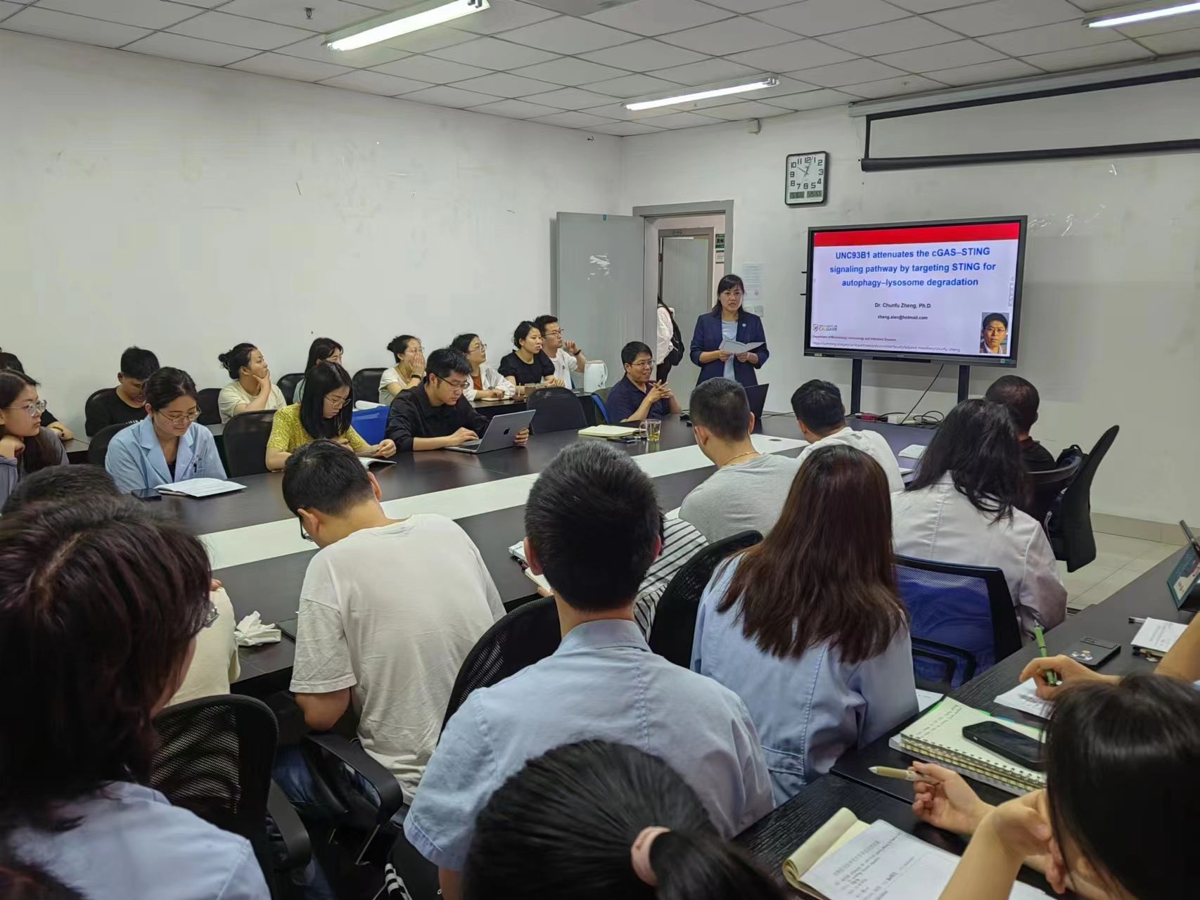 报告中,郑春福教授跟大家分享了发现UNC93B1蛋白背后的故事,详细讲述了UNC93B1通过自噬-溶酶体途径靶向降解STING的作用机制。郑教授团队通过UNC93B1基因敲除小鼠在体内证实了UNC93B1能够负向调控cGAS-STING信号通路,揭示了一种全新的抗病毒天然免疫应答机制。郑教授还在实验设计、论文写作和论文投稿等方面跟大家分享了宝贵的经验。报告后,陈舜副院长、部分教师代表和学生代表与郑教授积极互动,就感兴趣的问题进行了深入交流与探讨,现场氛围非常热烈。本次会议对师生科研思路的拓展以及学术氛围的营造起到了非常积极的作用。