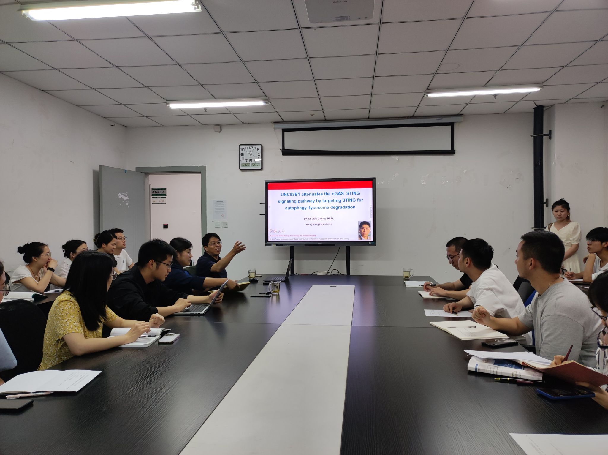 2023年5月16日上午,加拿大卡尔加里大学郑春福教授应bat365官方网站院长程安春教授和动植物检疫系徐志文教授邀请,在6-201会议室为全院师生做了题为“UNC93B1 attenuates the cGAS-STING signaling pathway by targeting STING for autophagy-lysosome degradation”的学术报告,会议由学院副院长陈舜教授主持。