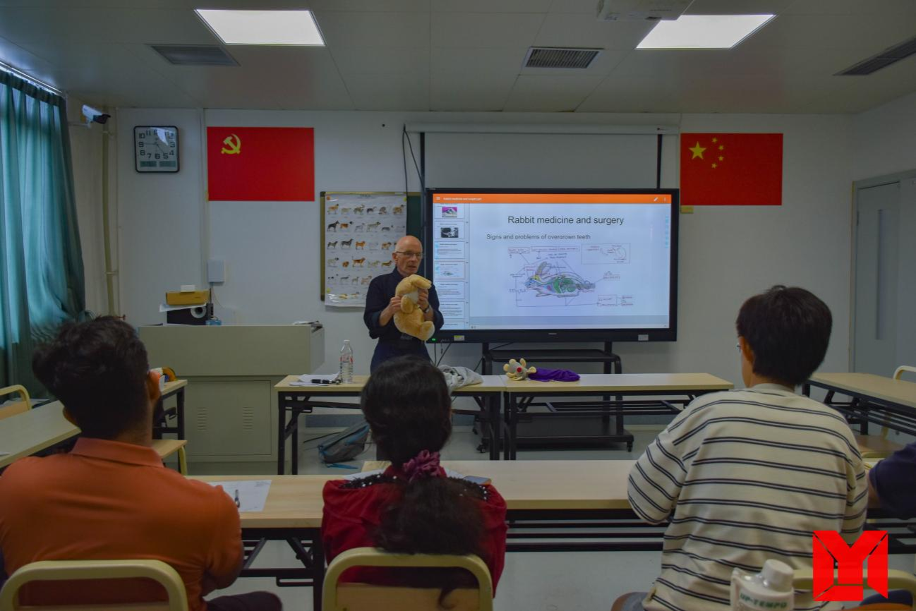在临床课堂讲学交流会中,Dr.Kimm以独特的教学方式吸引了学子们的目光。他利用各种动物玩偶和图片作为辅助工具,生动形象地讲解了不同动物可能出现的病症、病因以及相应的患病部位。特别是针对兔,他详细列举了可能出现的多种病症、携带的病毒以及生存环境对兔机体的影响,让学子们对兔的疾病防治有了更深入的了解。